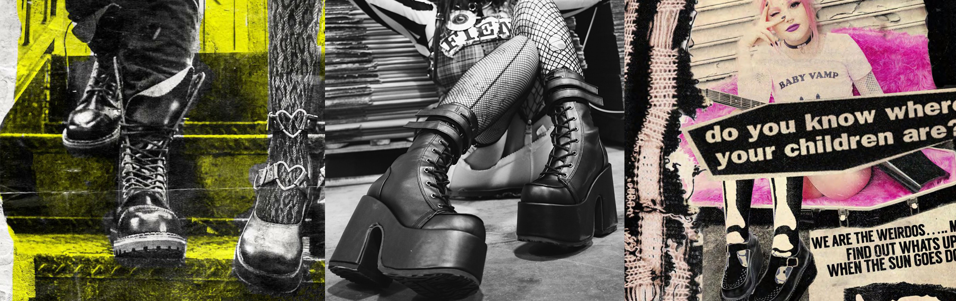 Vårt starkaste varumärke av skor och kängor är utan tvekan Dr Martens. Deras klassiska design passar många olika stilar från rock och punk till mer avskalad stil. Här hittar du alla varianter, klassiska 8-hålskängor,  höga skaft, creepers, platåskor och sandaler i material som läder, vegan och naturgummi. Vi har klassiska sneakers från Vans och Vision Street Wear. För en mer alternativ stil hittar du platåskor från Steel Ground och ballerinasandaler från Killstar. Söker du en riktig “show stopper” ska du kolla in Bettie Page, för skyhöga platåklackar. Andra märken du hittar hos oss är Undercover och Iron Fist