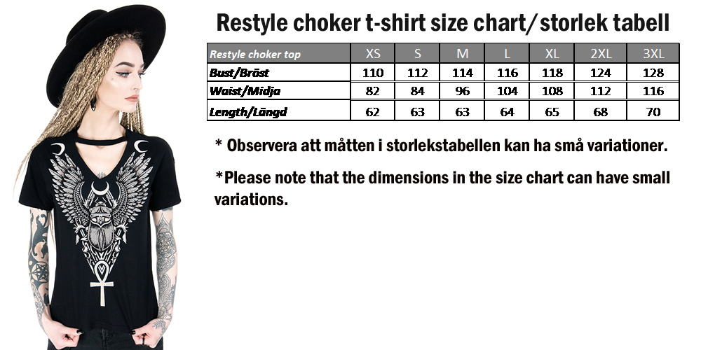 Choker Tee Ancient Scarab är en vacker egyptisk design-tshirt från Restyle. Detaljer i form av en utsmyckad choker, samt tryck av ett gammal Scarab omgiven av ankh-kors och halvmånar på bröstet. Tillverkad av slitstark bomull.