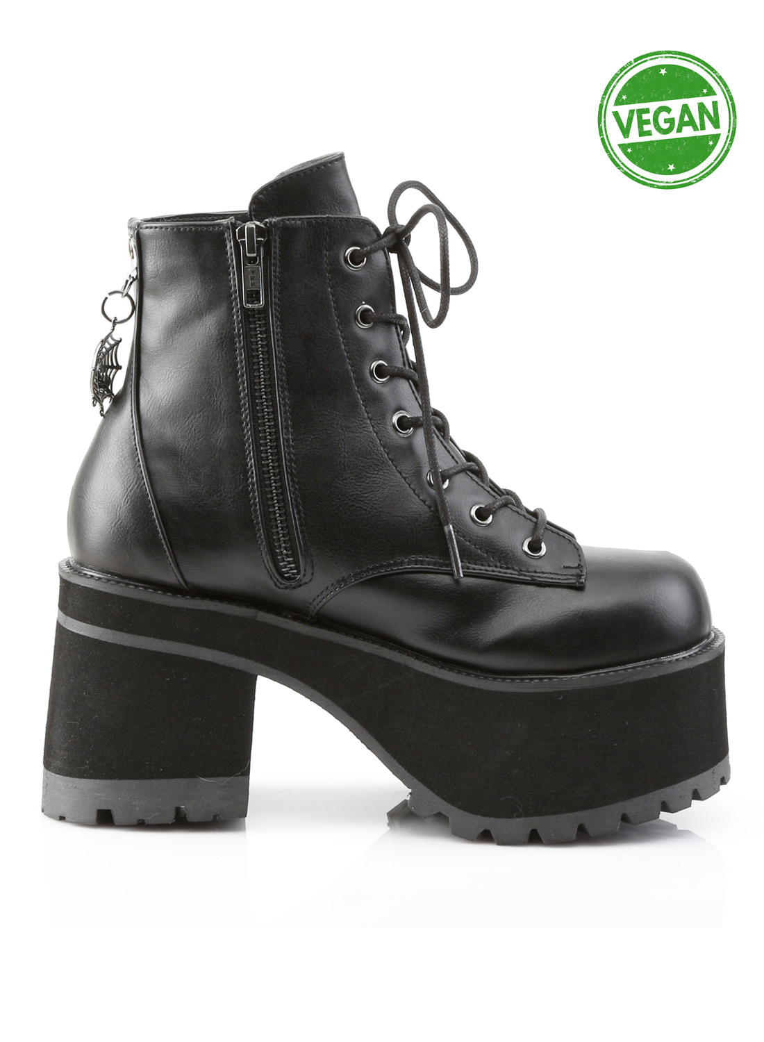 Demonia Ranger-105 Black är vegan skor/ boots från Demonia. 6,4 cm plattform och 10,2 cm klack. Ankelkänga med snörning fram, med spindelnätsberlock & broderidetaljer av spindelnät, dragkedja på insidan