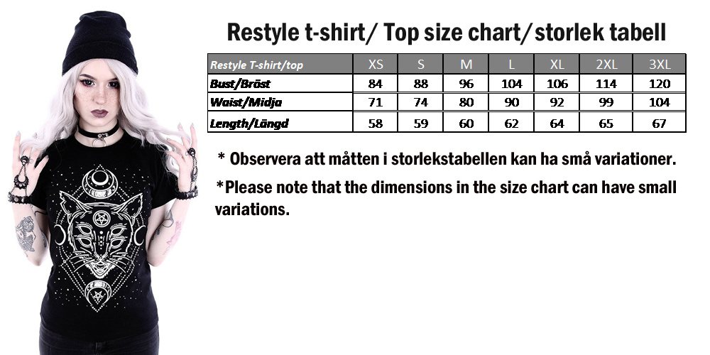 Galaxy Cat Black Tee är en snygg, gotisk t-shirt från Restyle. Modellen är tillverkad av bekväm, stark bomull. Trycket består av en stor gotisk, dubbelögad katt, samt en geometrisk bakgrund av stjärnor och månar. Perfekt för alla gotiska kattälskare!