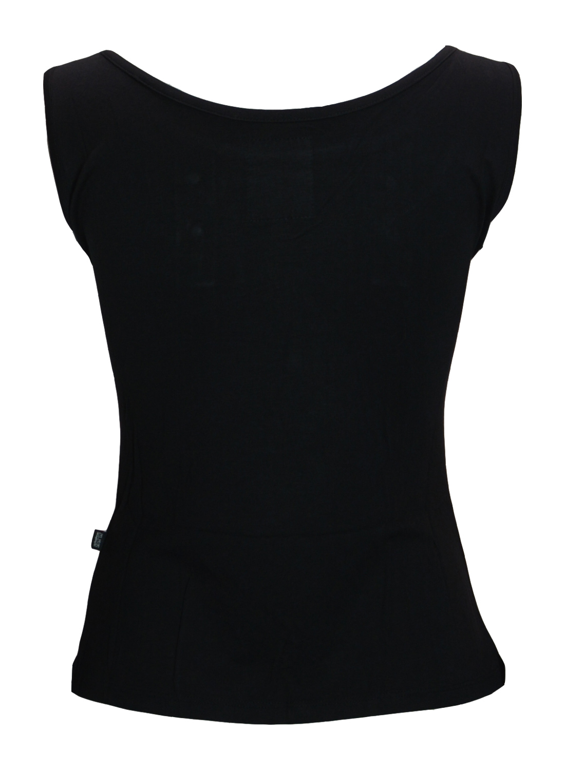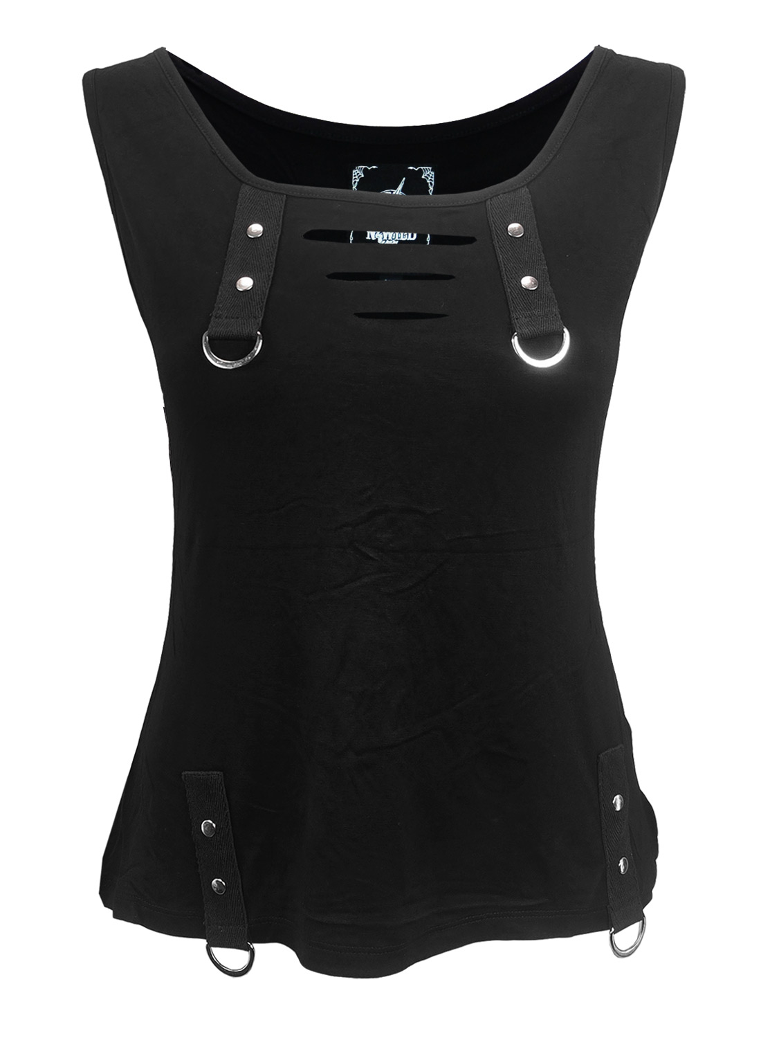Mit diesem schwarzen Tanktop mit industriellen Details und rohem Design stechen Sie durch Haltung hervor. Der Trikotanzug kombiniert eine feminine Silhouette mit ausgefallenen Details wie dekorativen Trägern, Metallringen und Nieten und schafft so einen einzigartigen und rebellischen Stil.