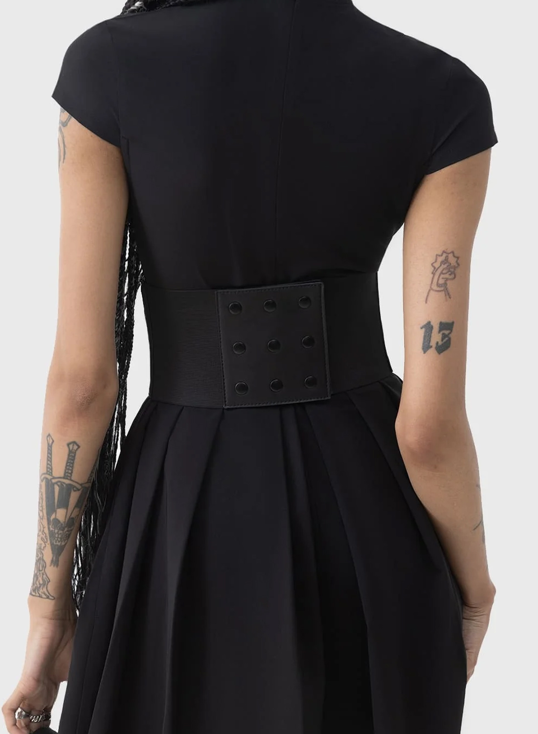 Der mittige Reißverschluss vorne wird mit einem auffälligen Monddetail kombiniert, wodurch ein einzigartiger Statement-Look entsteht, der sofort ins Auge fällt. Der Gürtel hat ein breites Design, das als Unterbrustkorsett fungiert und sowohl Stil als auch Halt bietet.