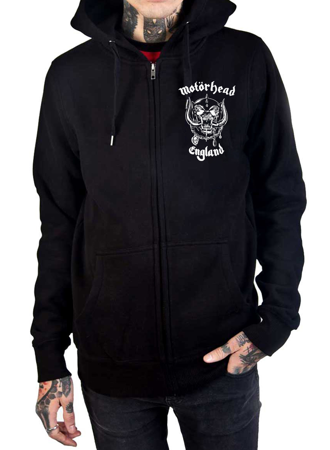 Klassiker Motörhead-Kapuzenpullover mit Reißverschluss in Schwarz mit dem ikonischen Warpig-Motiv und „Motörhead England“-Aufdruck auf der Brust. Auf der Rückseite befindet sich der legendäre Slogan „Alles lauter als alles andere“Damit ist der Hoodie ein Must-Have für alle Fans der Band und der Heavy-Metal-Kultur.