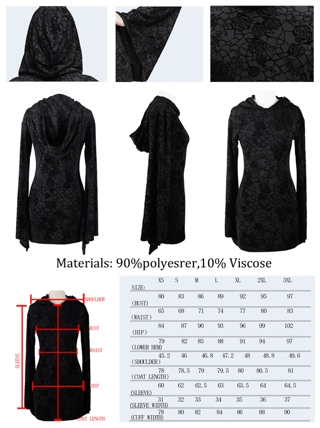 Vampire rose hood/klänning från Restless ‘N’ Wild. Lyxig mjuk stretchjersey för en smickrande och förförisk passform. Överdimensionerad huva, långa och vida ärmar med svarta rostryck. Den här klänningen är perfekt för en dejt med djävulen. Åh så mångsidig – perfekt från skymningen till gryningen. Ser fantastisk ut med -klackar+netstrumpor + en choker – mixa och matcha som ditt mörka hjärta önskar!